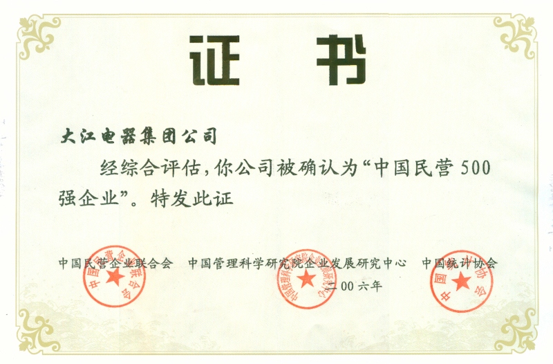 - 2006年中國民營500強(qiáng) 榮譽(yù)證